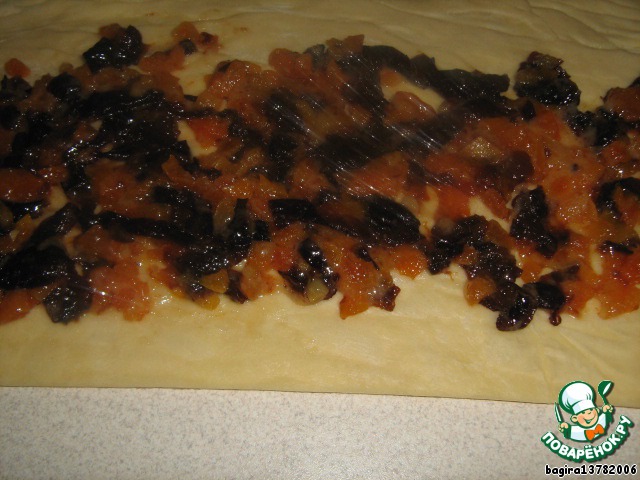 На вторую часть теста кладем начинку из сухофруктов, и так же сворачиваем.