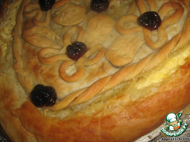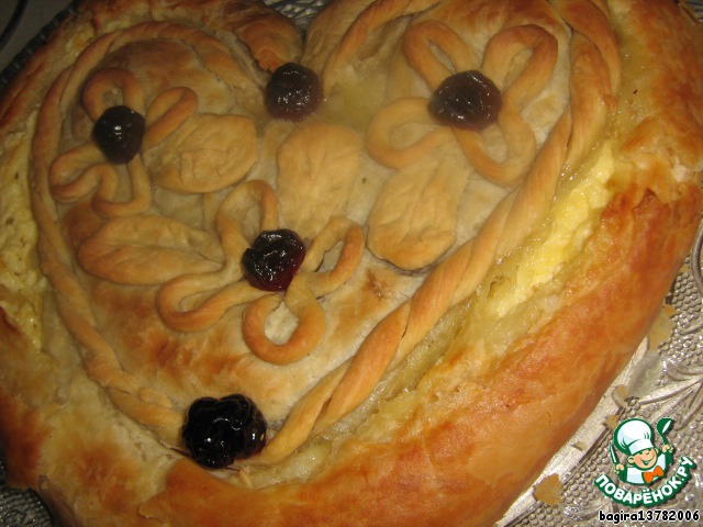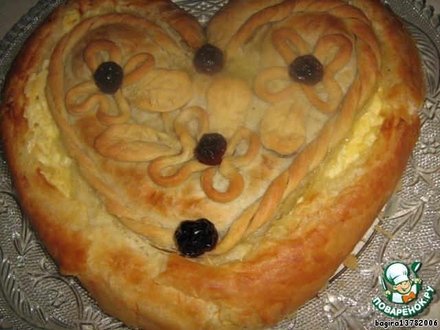 Я побаивалась, что серединка пирога не пропечется - все таки стык"сердца" был толстоват, да и листочки сверху присутствовали, но все обошлось - сырого участка не было.