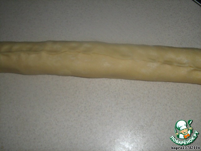 Готовое тесто скатаем колбаской и разделим на 12 кусочков.