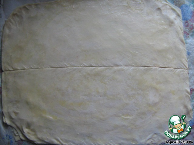 Затем срезаем толстые края (они всегда бывают толстыми) и разрезаем наш слоистый масляный пласт на две части.