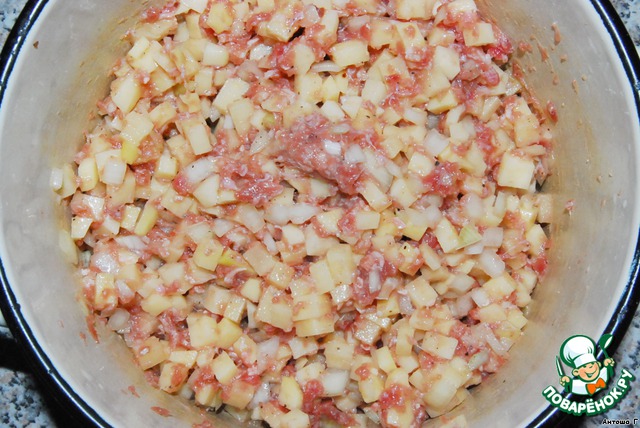 Картошку режем маленькими квадратиками и смешиваем с фаршем. Туда же добавляем мелко нарезанный лук. Всё хорошо перемешиваем.