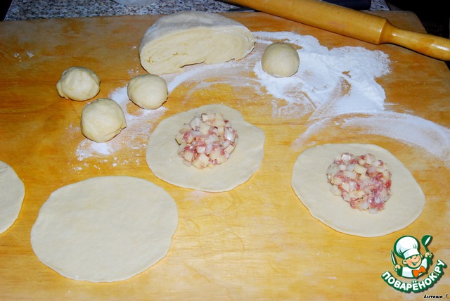На кружочки выкладываем фарш. Чтобы фарша хватило на все тесто, его тоже лучше поделить ложкой прямо в кастрюльке на 4 части, и потом уже каждую часть раскладывать на 4 кружочка.