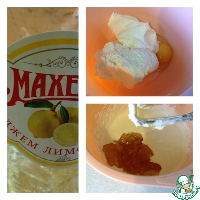 Творог, яйцо, сметану и крахмал взбить. Затем добавить джем и взбить еще немного