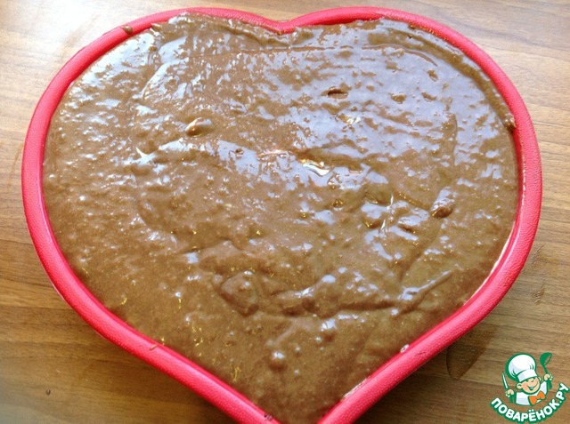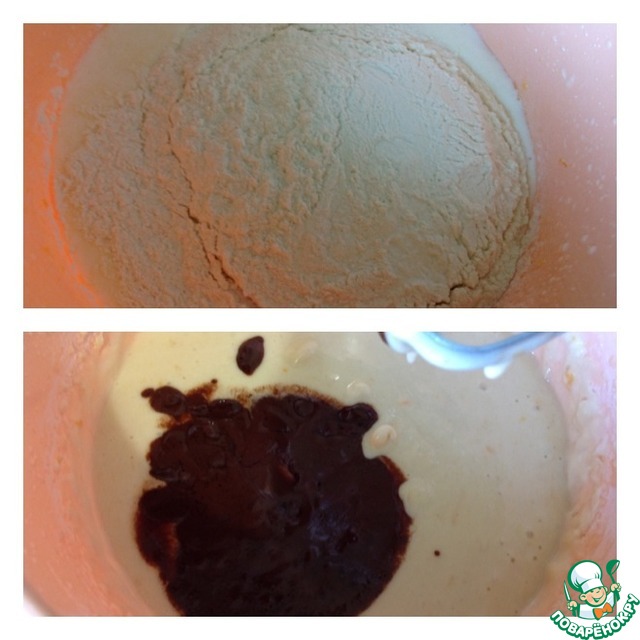 Добавить разрыхлитель, муку и взбить. Добавить уже слегка остывший шоколад и взбить еще немного