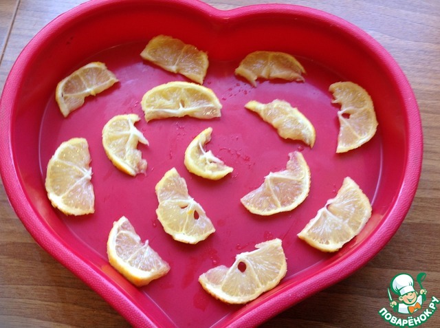 С лимона с которого снимали цедру, нарезать полукольцами, семечки удалить и выложить на дно формы
