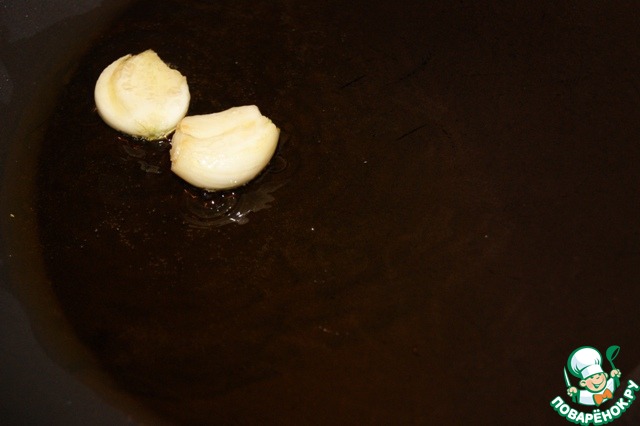 Нагреть 50 мл масла и обжарить в нем раздавленный чеснок.