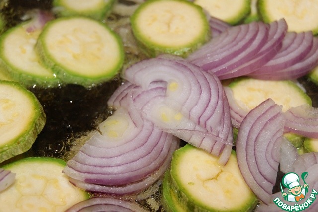 Удалить чеснок. Добавить лук, нарезанный полукольцами, и нарезанный кольцами кабачок. Тушить 2 минуты. Отложить в отдельную емкость. Масло оставить в сковороде.