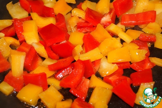 В оставшемся масле 2-3 минуты потушить нарезанный кубиками (1 см ) перец. Откинуть его к кабачкам. Масло оставить.