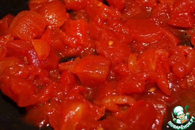 Нарезанные на кусочки и очищенные от кожицы и семечек помидоры тушить почти до полного испарения жидкости.
