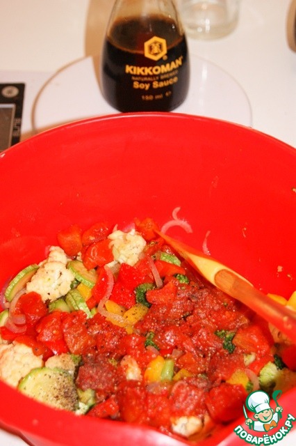 Соединить все овощи вместе, посолить и поперчить по вкусу и, добавив соевый соус, перемешать. Остудить.