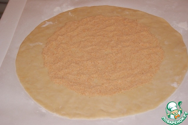 На пекарской бумаге, слегка присыпанной мукой, раскатать тесто в круг диаметром 34 см. Отступить от края 4 см и по всей оставшейся поверхности распределить сухари.