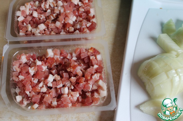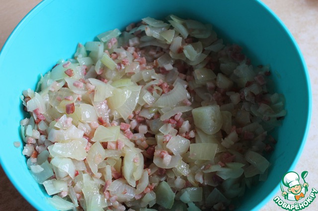 Вместо сала я взяла мелконарезанный бекон. Все это обжариваем на сковороде.
