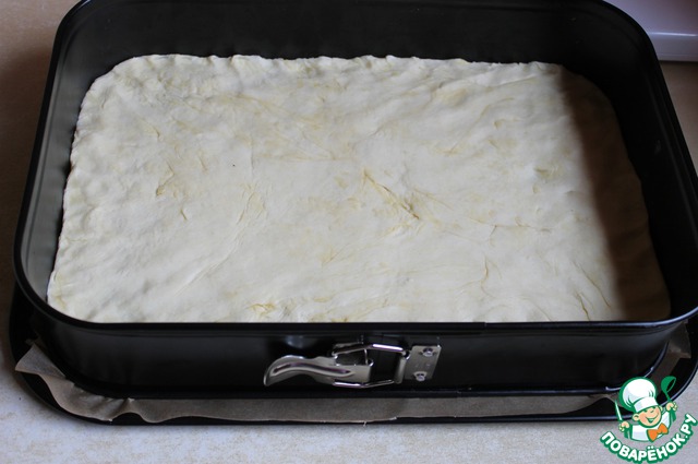 Берем форму или лист. У меня 24x34см. Тесто выкладываем, тонко раскатаем. Бортики не делаем.