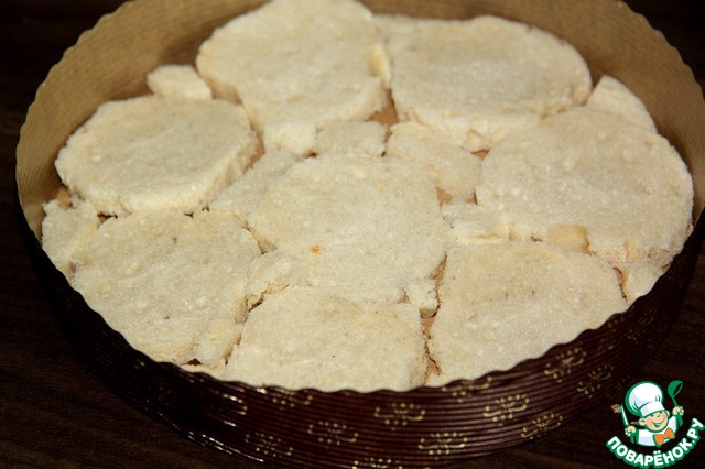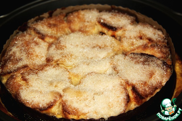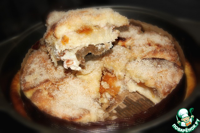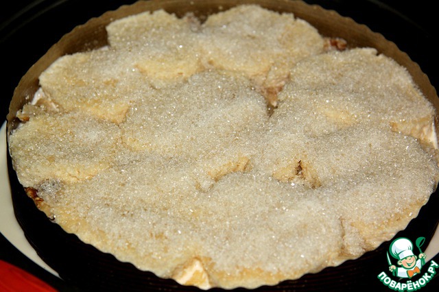 Закрыть хлебными ломтиками, залить яйцом и сливками и посыпать сахаром.