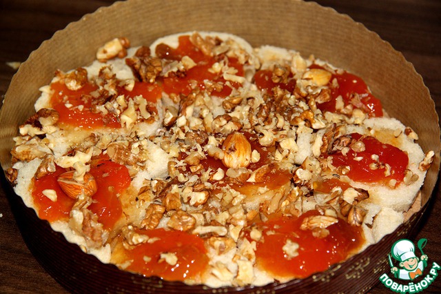 На хлеб выложить абрикосовое варенье и грецкие орехи.