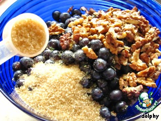 Для начинки смешайте виноград, орехи, щепотку соли, розмарин и коричневый сахар (больше или меньше в зависимости от того, насколько сладкий/кислый виноград).
