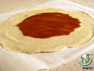 На листе пергаментной бумаги раскатайте тесто в круг диаметром примерно 30 см. Дно круга смажьте медом или густым сиропом от варенья.
