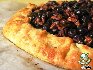 Перенесите лист с тестом на противень. Аккуратно выложите виноград в центр. Свободные края поднимите и произвольно защепите.