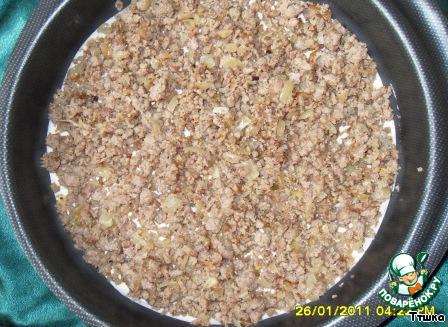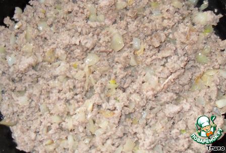 В лук добавляем 400г фарша (у меня свиной) и обжариваем. Солим и перчим по вкусу.