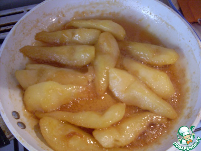 Разогреть сковороду, высыпать в нее 120 гр сахара. Когда сахар расплавится, выложить на сковороду груши и дать им закарамелизироваться со всех сторон.