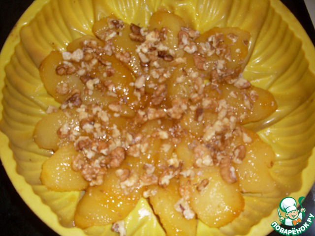 Ядра грецких орехов слегка покрошить руками и выложить на груши.