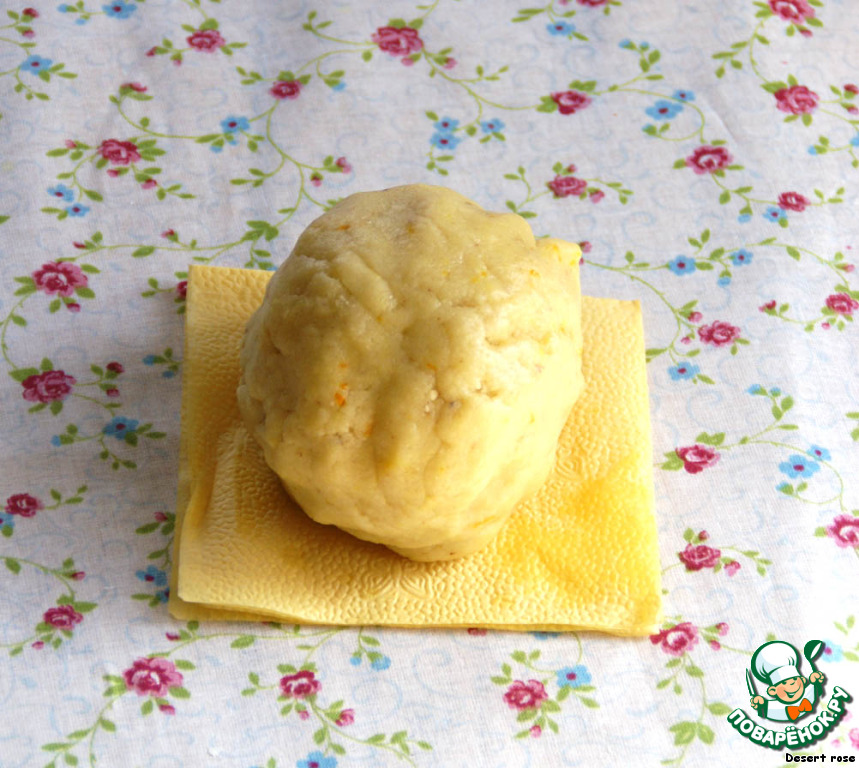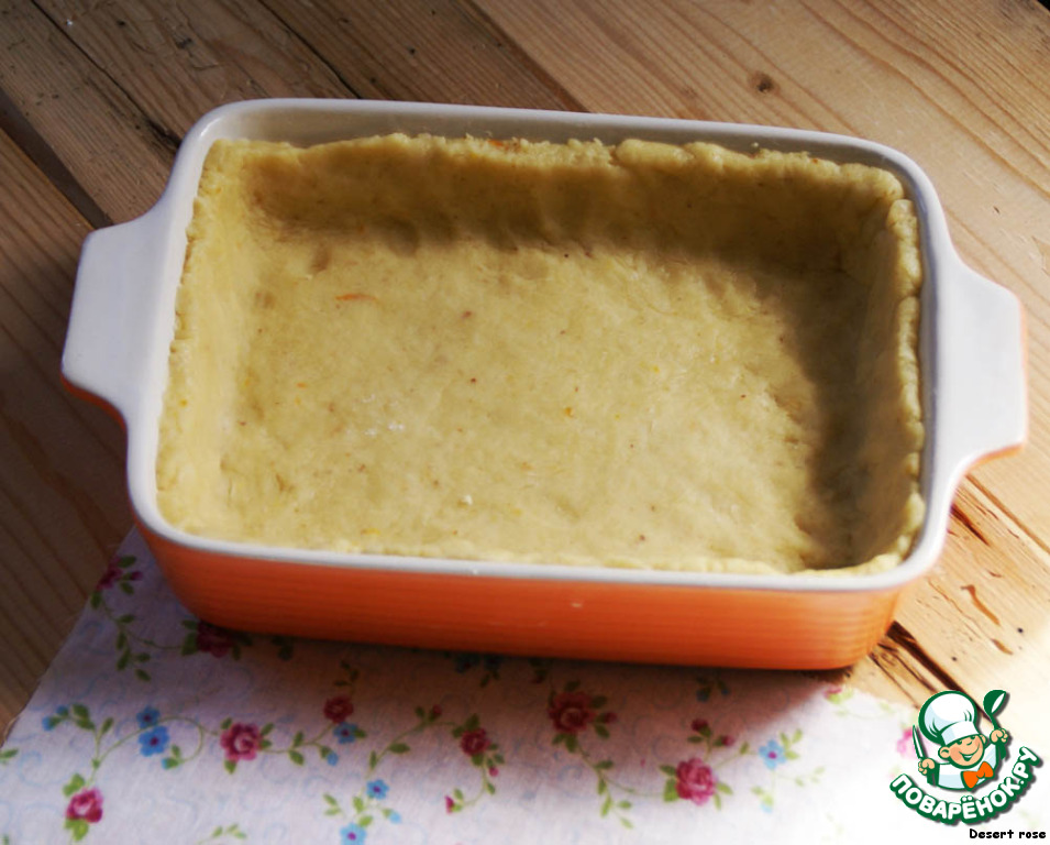Приготовить песочное тесто. Просеять муку, добавить в нее полстакана сахара, разрыхлитель теста, тертую цедру лимона или апельсина и миндальную муку.