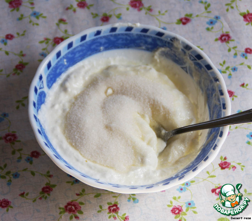 Рикотту размешать с сахаром (1/2 стакана) до растворения крупинок.