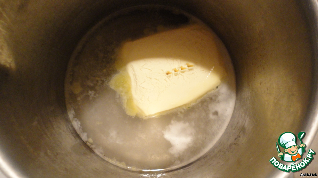 Особо наблюдательных прошу не кидать тапками. Сел аккумулятор на фотоаппарате, поэтому фотографии для «начального этапа» приготовления взяла с этого своего рецепта http://www.povarenok.ru/recipes/show/62921/ , т.к. они одинаковые. И так, в слегка подсоленной и доведенной да кипения воде, растворяем сливочное масло (или маргарин).