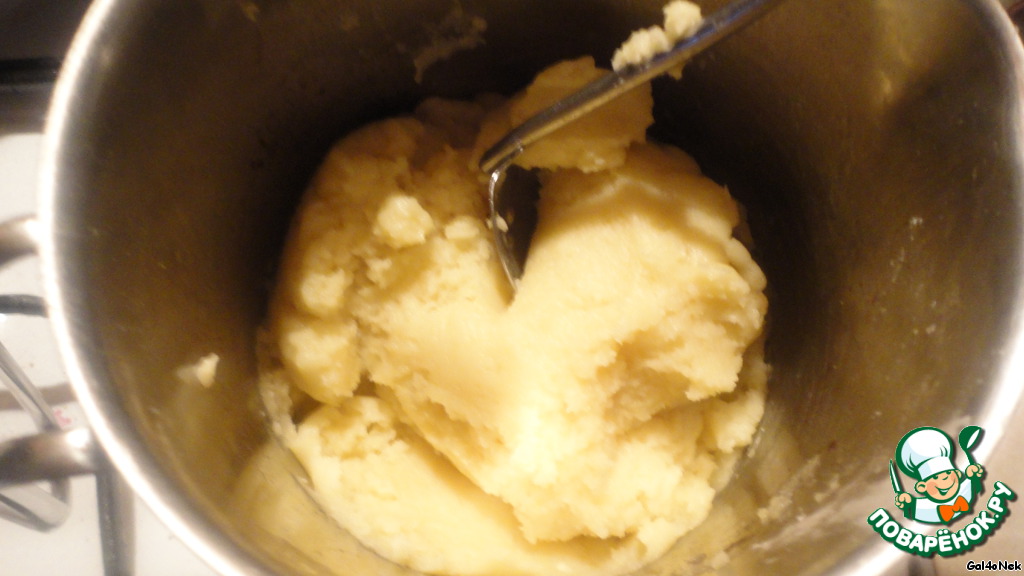 Добавляем муку и, интенсивно помешивая, доводим до загустения. Слегка остужаем тесто и вбиваем по-одному яйца, тщательно вмешивая каждое до гладкости теста.