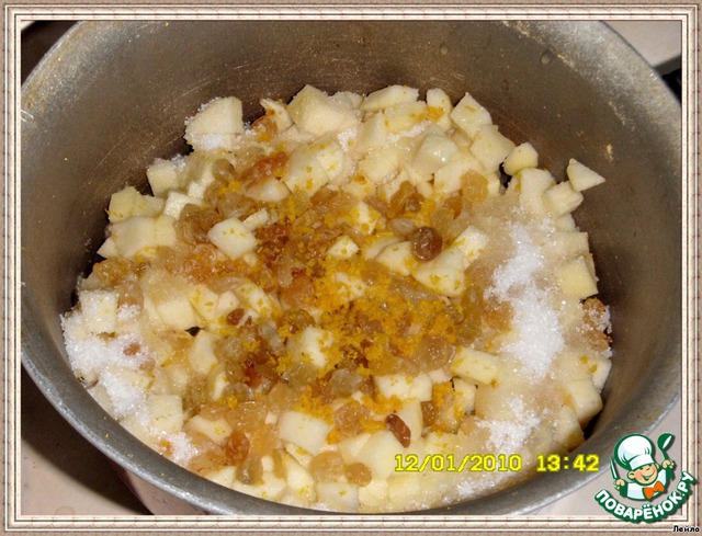 [b]Начинка № 1[/b]2 яблока без шкурки, нарезанных кубиками,1/4 стак.сахара,1ст.л.лимонного сока,1/2 стак.апельсинового сока,цедра апельсина,3/4 стак. изюма