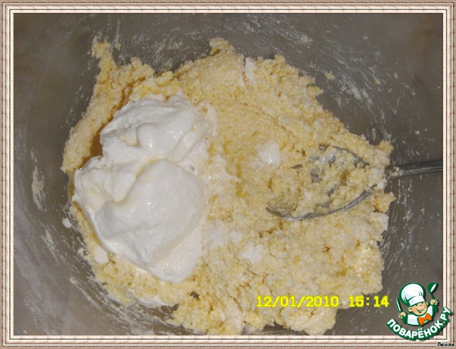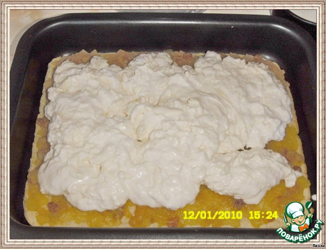 [b]Начинка № 2:[/b] 500гр творога, 1/2 стак. сахара,1 ст.л. муки,просеять,4 яйца,разделить желтки с белками,ванилин,1/2 стак. сливок густых