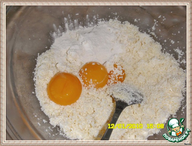 В глубокой чашке смешать муку с маслом и сахаром, желток растираем руками