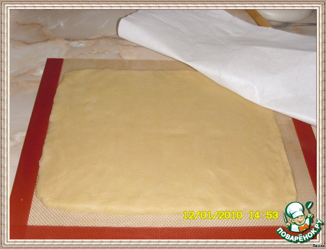 сверху также положите кальку, так не будет липнуть тесто к скалке и ровно раскатается.