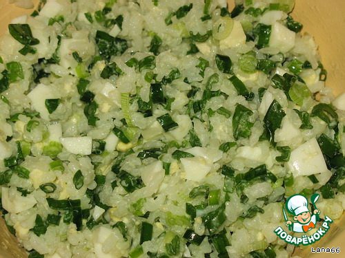 покрошить и смешать с рисом и луком. Посолить и добавить