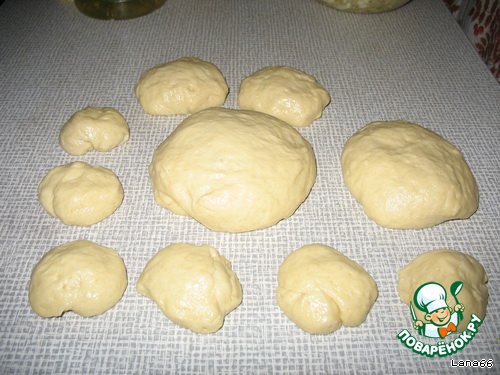 В этом случае тесто делить не надо. Просто раскатать скалкой тесто