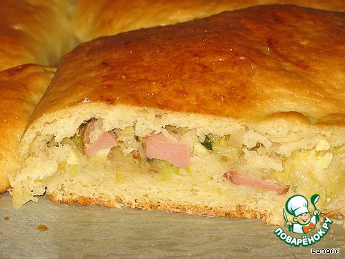 для картофельной начинки. Молодую капусту мелко нашинковать и добавить к луку. Посолить и потушить. Добавить сосиски. Молодая капуста тушится очень быстро. Старайтесь, что бы начинка не получилась слишком сочной.