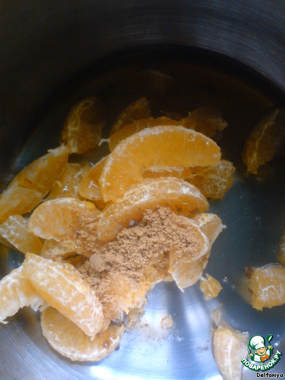 Вторая начинка была посложнее. Сначала я закарамелизировала дольки двух маленьких мандаринов, очищенных от косточек. У нас они называются тайские тангерины, и прозрачные шкурки на дольках не горчат при термообработке. Марроканские мандарины, если будут таким же образом обрабатываться, могут горчить. На всякий случай их лучше снять. Налить воды около стакана и четверть стакана коричневого сахара, готовить на медленном огне до выпаривания жидкости. А дольки станут темно-коричневыми. Как только снимаем их с огня, нужно тут же вмешивать остальные фрукты, чтобы дольки не успели застыть. Иначе из них могут получиться леденцы.