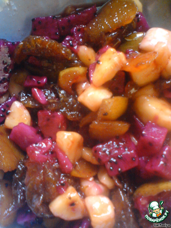 Питтахайю, или драконий фрукт, я использовала в основном для придания цвета. Она в готовом изделии разваривается в духовке и придает «эффект ягод». Вместо нее спокойно можно использовать любые красные ягоды. У нас их нет, к сожалению, даже в замороженном виде. А мне очень хотелось воссоздать то, что я ела в России.