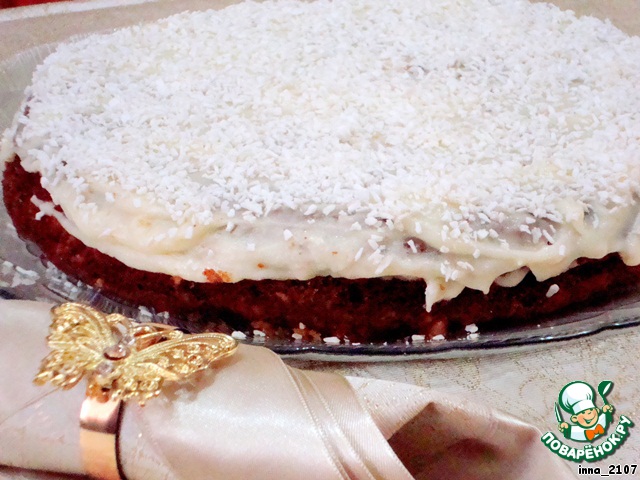 Смазать корж кремом, сверху положить вторую часть коржа, затем оставшийся крем и посыпать кокосовой стружкой.