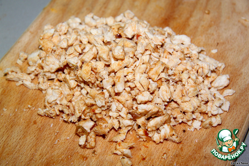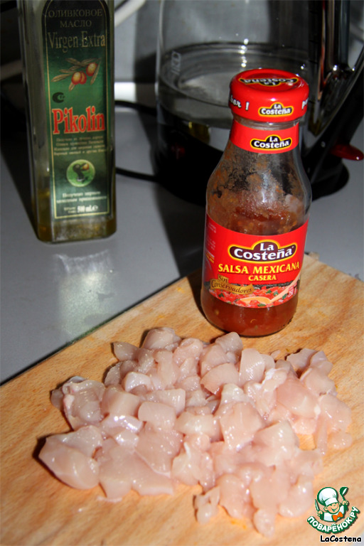 Охлажденную куриную грудку нарезала кубиками и залила своим любимым соусом. Солить и перчить курицу больше не надо.