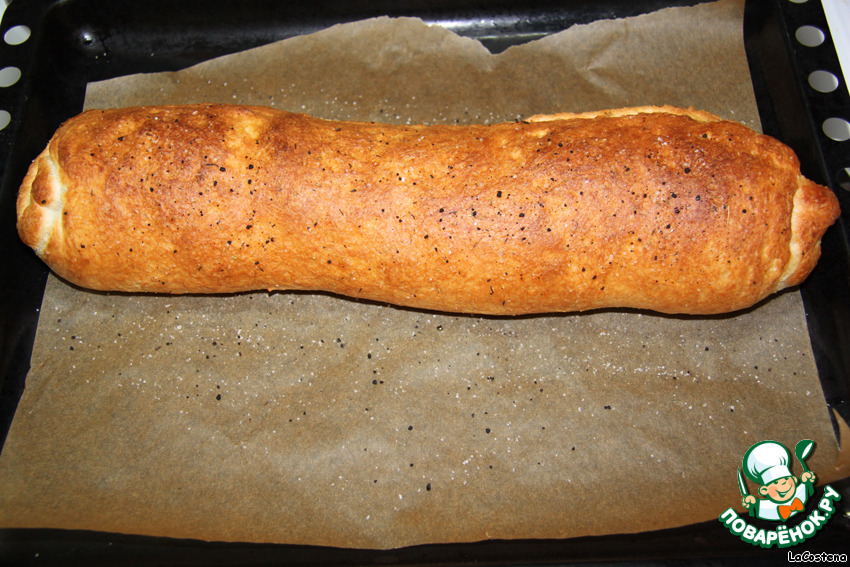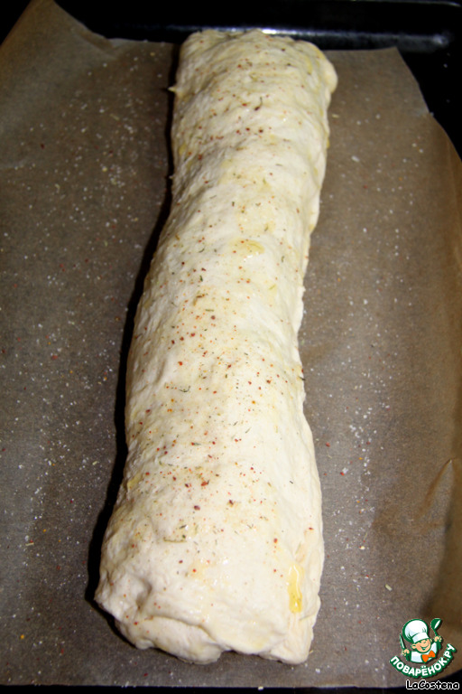 Свернула рулет, полила оливковым маслом и поставила в духовку.