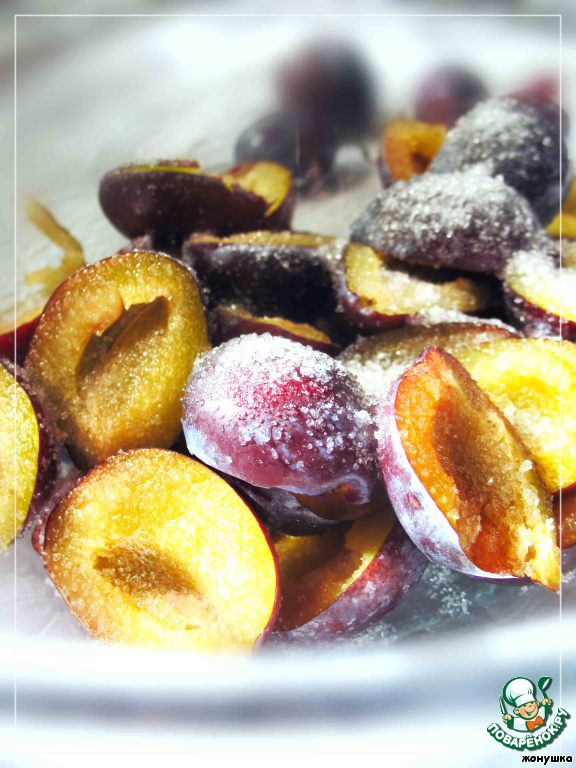 Сливы очистить, смешать с сахаром, лимонным соком и крахмалом.