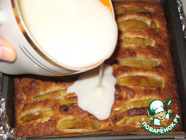 Как наш пирог будет готов в заливку добавить ложку лимонного сока, перемешать и вылить заливку на горячий пирог, распределив ее равномерно по всей поверхности.