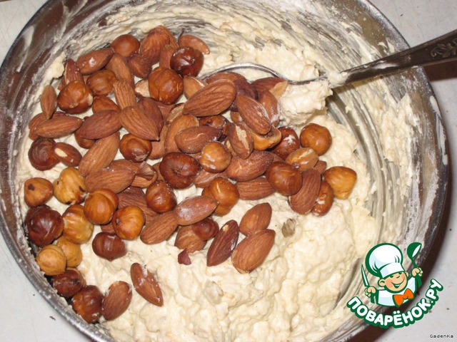 Я взяла половину миндаля, половину фундука, не стала я с ними ничего делать лишнего, только обжарила в духовке, чтобы имели насыщенный вкус, аромат и были хрустящими, в сыром виде они не очень гармонируют в выпечке.