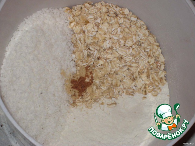 Кокосовую стружку, стакан муки и овсянки с разрыхлителем смешать.