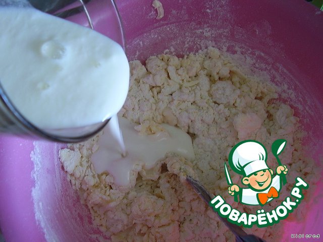 Влить кефир, перемешать, добавить остальную муку.