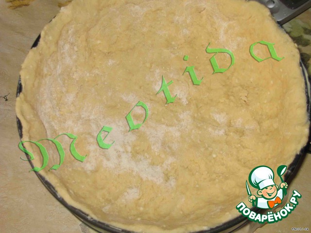 Дно разъемной формы застелить бумагой для выпекания, смазать ее и бортики хорошенько маслом. Выложить тесто, растягивая тесто от центра к верху бортика и слегка защипляя наверху, чтобы тесто при выпекании не съехало вниз. На пирог сверху положить пергамент и засыпать его фасолью (горохом), выпекать в разогретой до 215 С дузовке 15 минут.