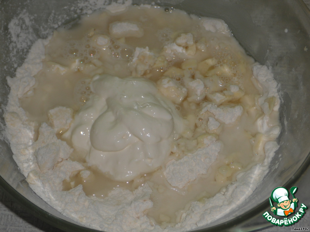 В муку выложить холодное сливочное масло и все мелко порубить ножом. Добавить сметану и воду.