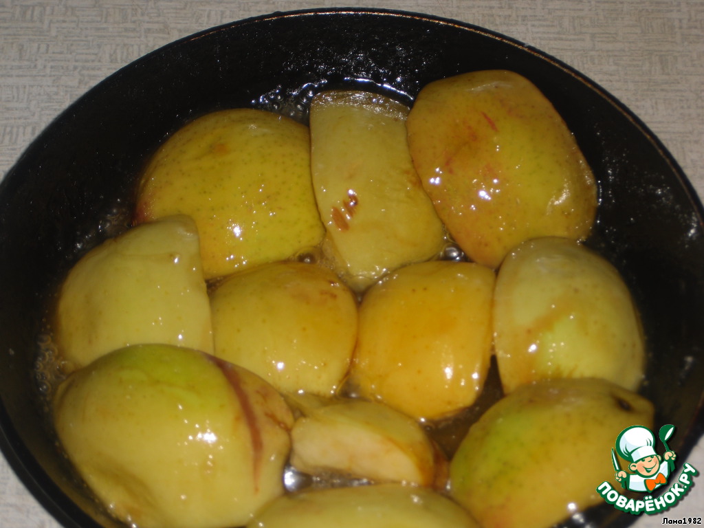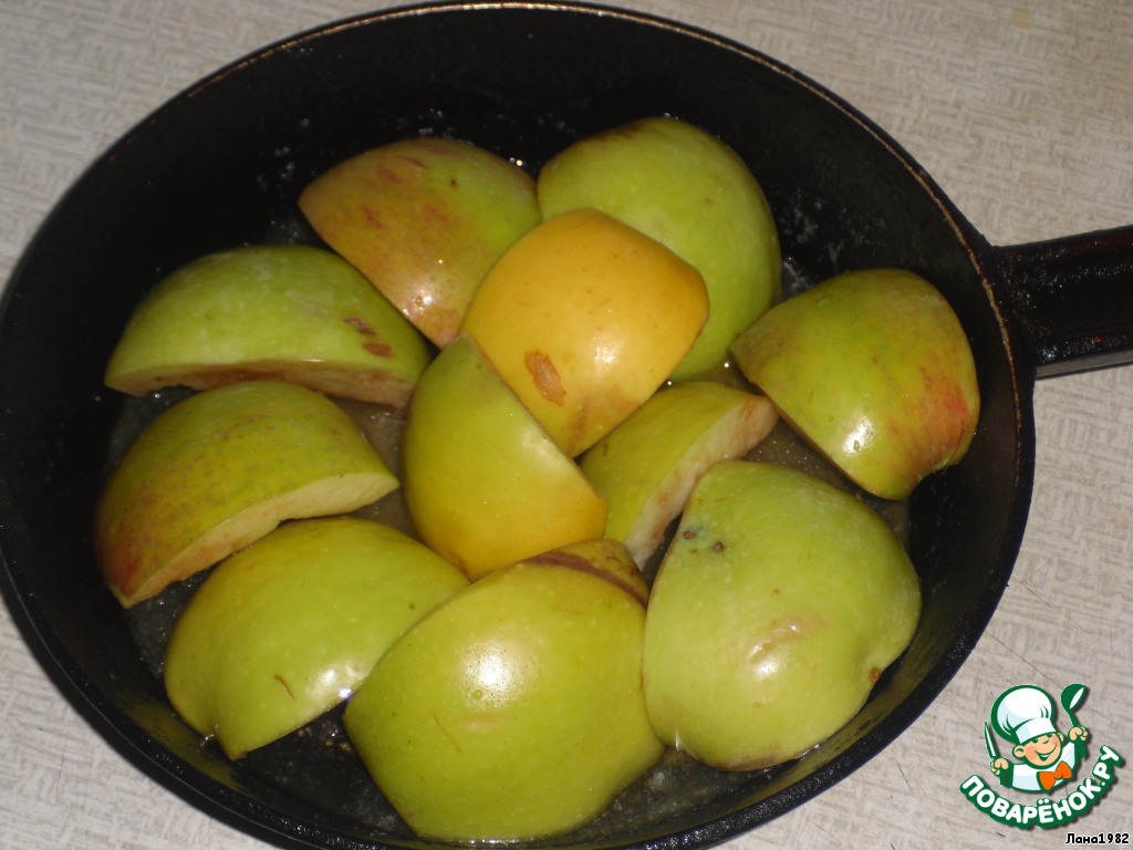 Тушить на сильном огне в течении 10 минут. Яблоки перевернуть и тушить еще 5 минут.