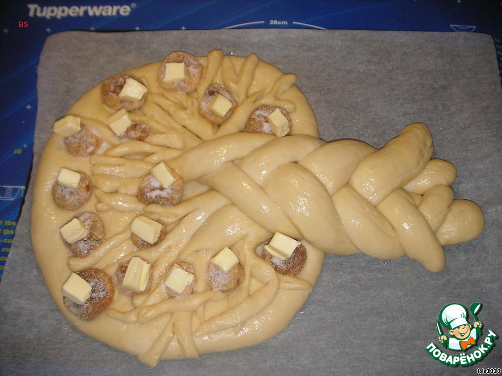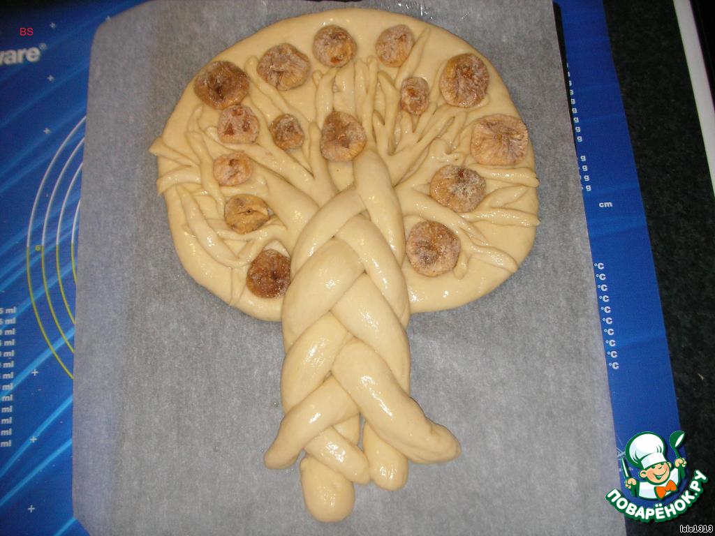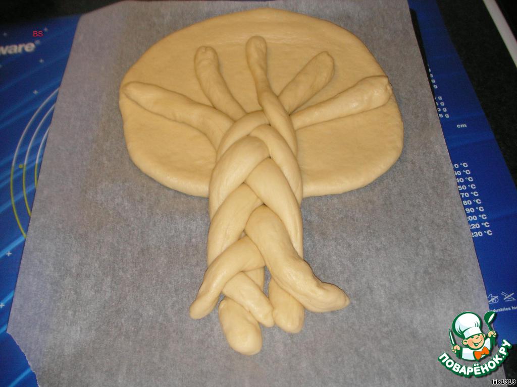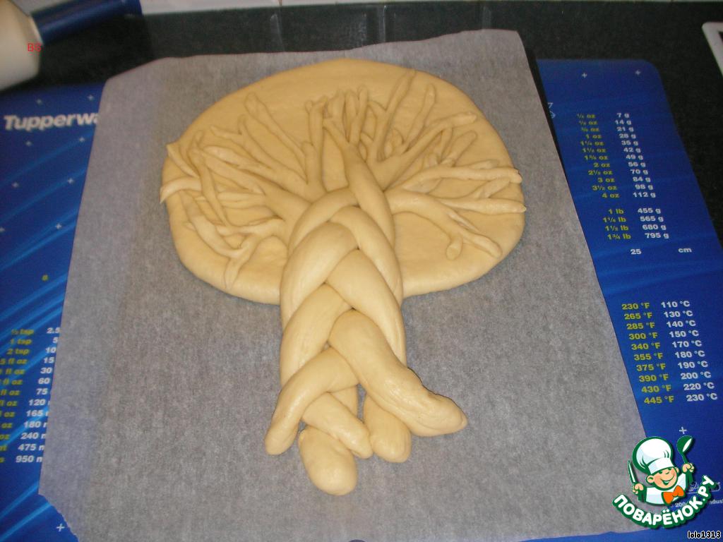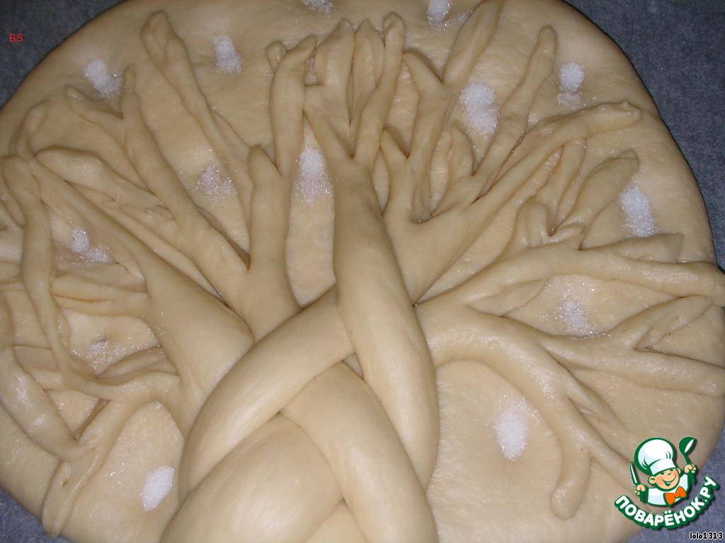 Переложить косу на круг таким образом, чтобы придать двум частям теста форму дерева.
